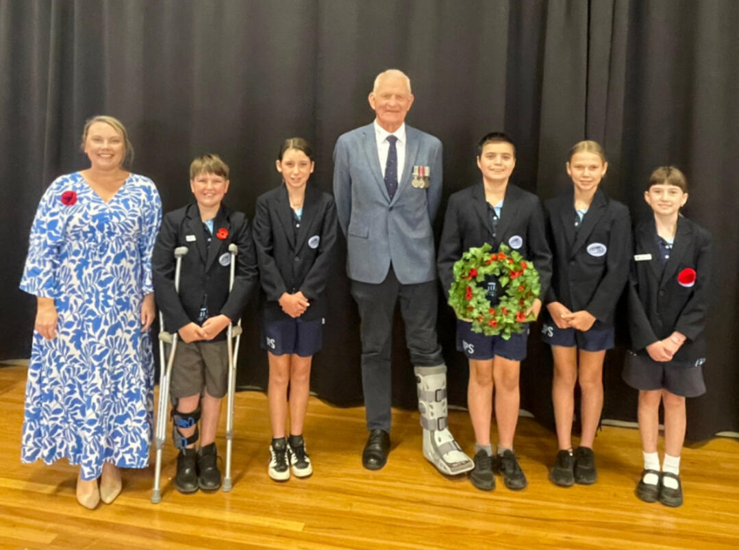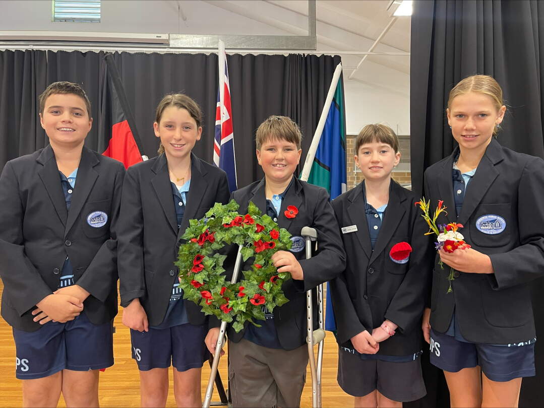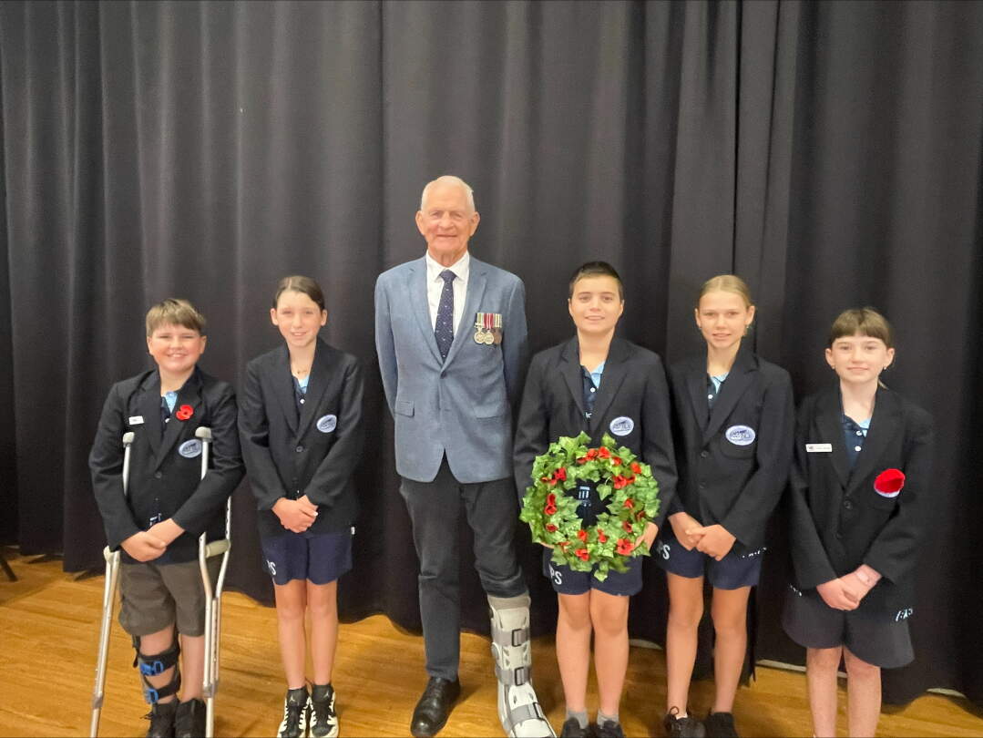 Remembrance Day ServiceOn 11 November, we held our Remembrance Day service, led by our school leaders Sienna, Zane, Indi and Luca. Samara sensitively delivered the 'In Flanders Fields' poem, while Ava and Maleah supported with technology. We were fortunate to have Mr Michael Souter from the RSL Club join us. Students placed flowers on the stage as a symbol of remembrance, and Mr Souter was deeply moved by the respect shown by our students.