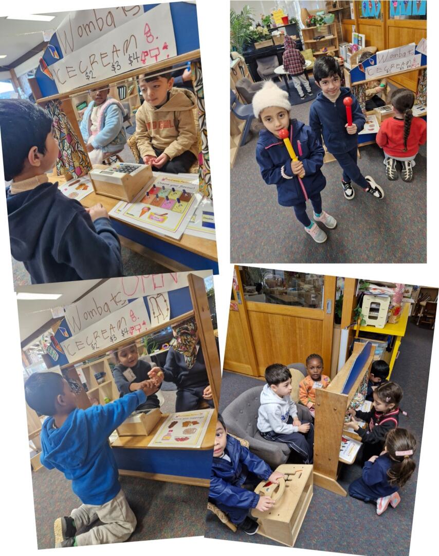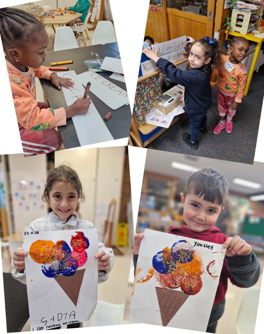 This term we set up and "Ice cream truck" with the children, which was sparked by their interest of selling ice cream. The children were questioned by their educators and brainstormed what they needed to set up the ice cream shop. They decided they needed money and a cash register. They also needed a driver and wheels for the ice cream truck. Children helped to create a sign for the ice cream and helped to write words. There was lots of learning, negotiating and taking on roles by using their imagination to buy and sell ice cream. The children spoke about their favourite ice cream flavours and created their own ice cream artwork.