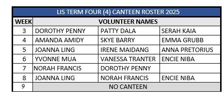 We are currently organising classes for the 2026 school year. If you know your child / children will not be attending Lihir International School in 2026, and you have not yet informed Cathy or myself, please let us know as soon as possible, so that year level numbers and class organisation can be finalised. 2026 classes will be announced in week 9.