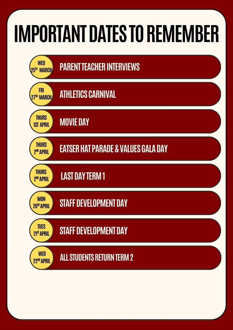 We are looking forward to our upcoming Athletics Carnival on Friday 27 March. This is always a wonderful day for our school community, giving students the opportunity to participate, challenge themselves and demonstrate great sportsmanship. We encourage all students to get involved, do their best and enjoy the day.