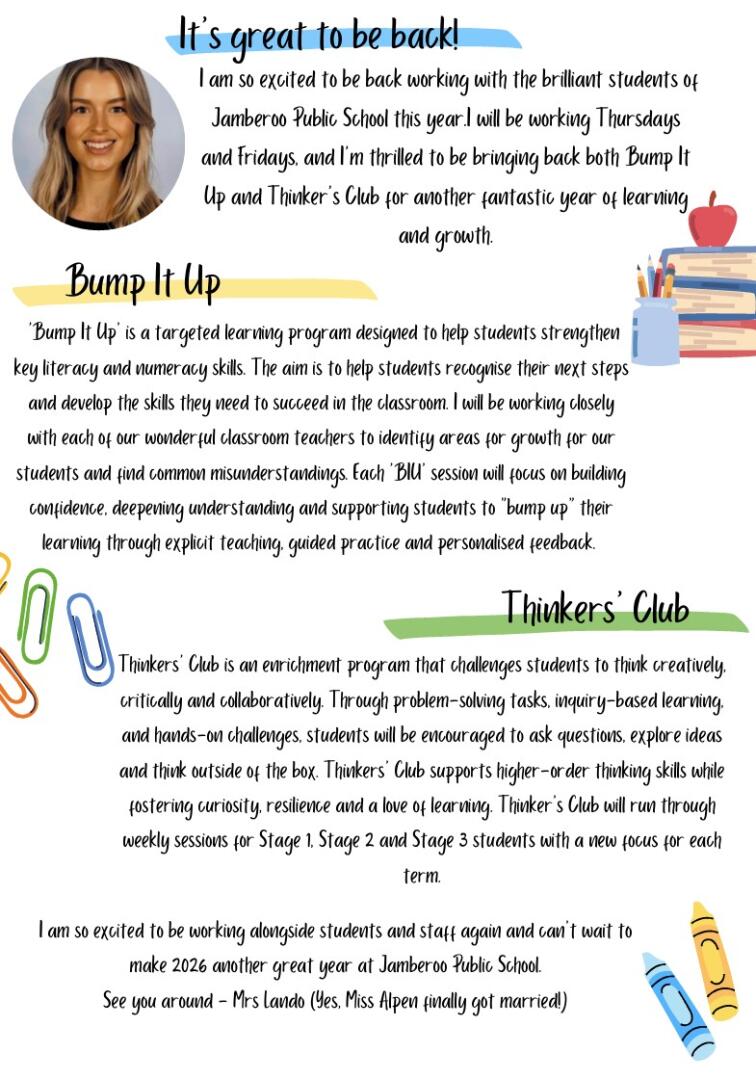 Bump It Up, Enrichment and Learning SupportWe are pleased to welcome Mrs Lando back to Jamberoo Public School, working Thursdays and Fridays this year. Mrs Lando will be leading Bump It Up, a targeted literacy and numeracy program supporting students to strengthen key skills and identify their next learning steps, as well as Thinkers’ Club, an enrichment program designed to challenge students to think creatively, critically and collaboratively.