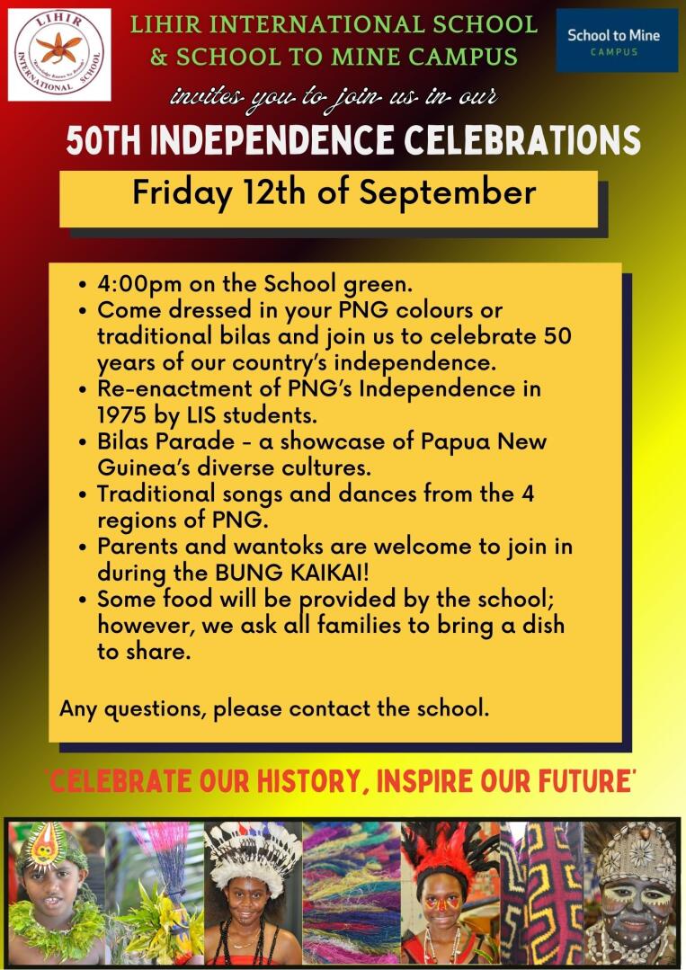 With the Governor General and the National Executive Council declaring Monday 15 and Wednesday 17 September as public holidays in commemoration of the 50th Independence Anniversary Celebrations, the last day of term 3 for LIS will change from Thursday 18 September to Friday 12 September.