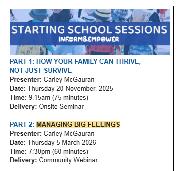 3rd - Carley McGauran Managing Big Feelings online session @ 7:30pm