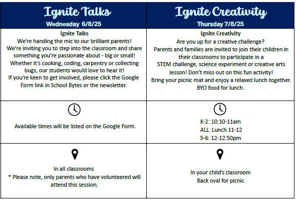 We look forward to having parents in classrooms on Wednesday (those who have signed up) and our open day on Thursday for a fun classroom session and picnic lunch.